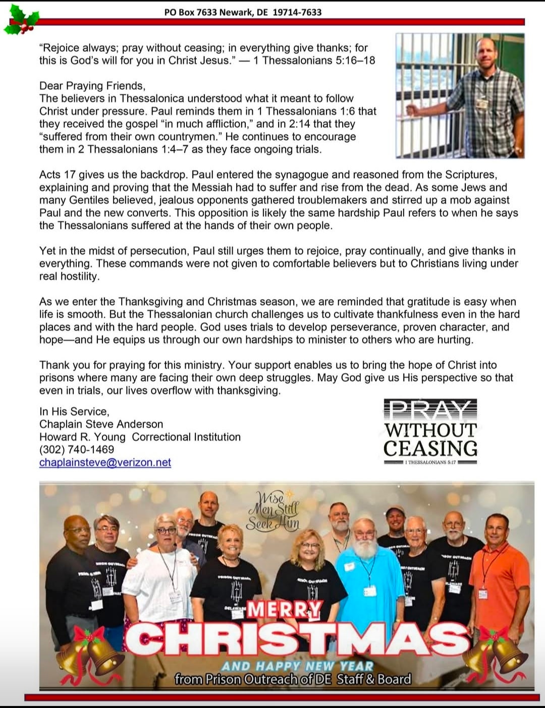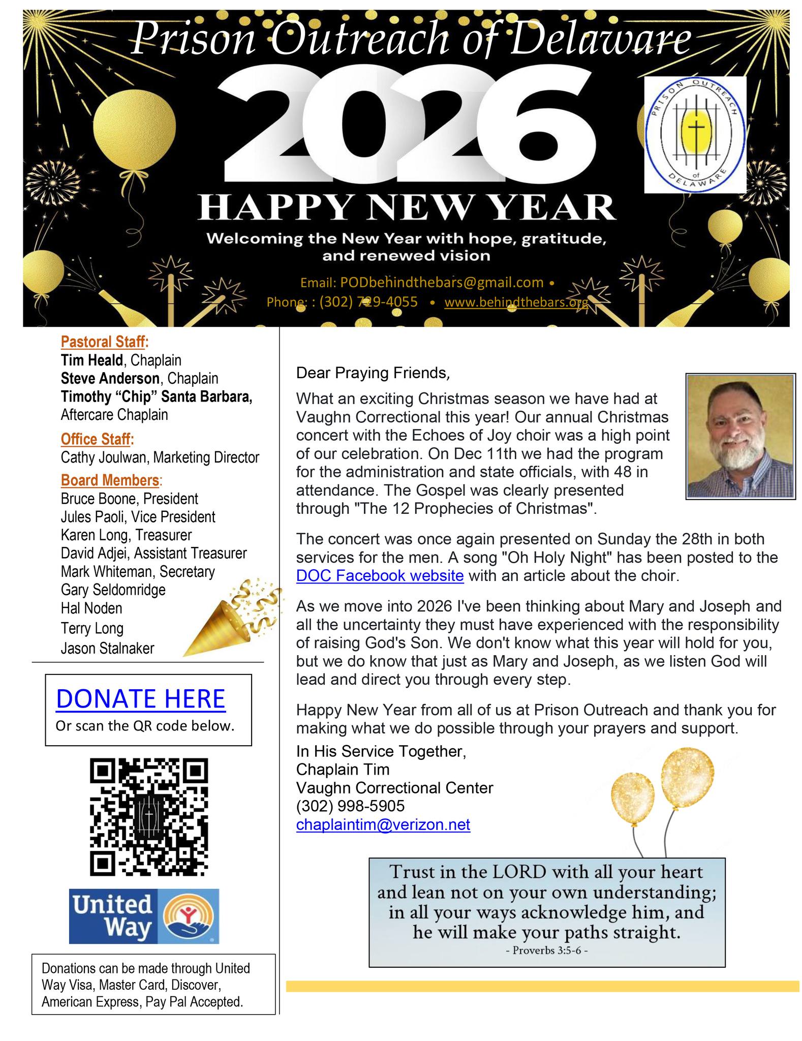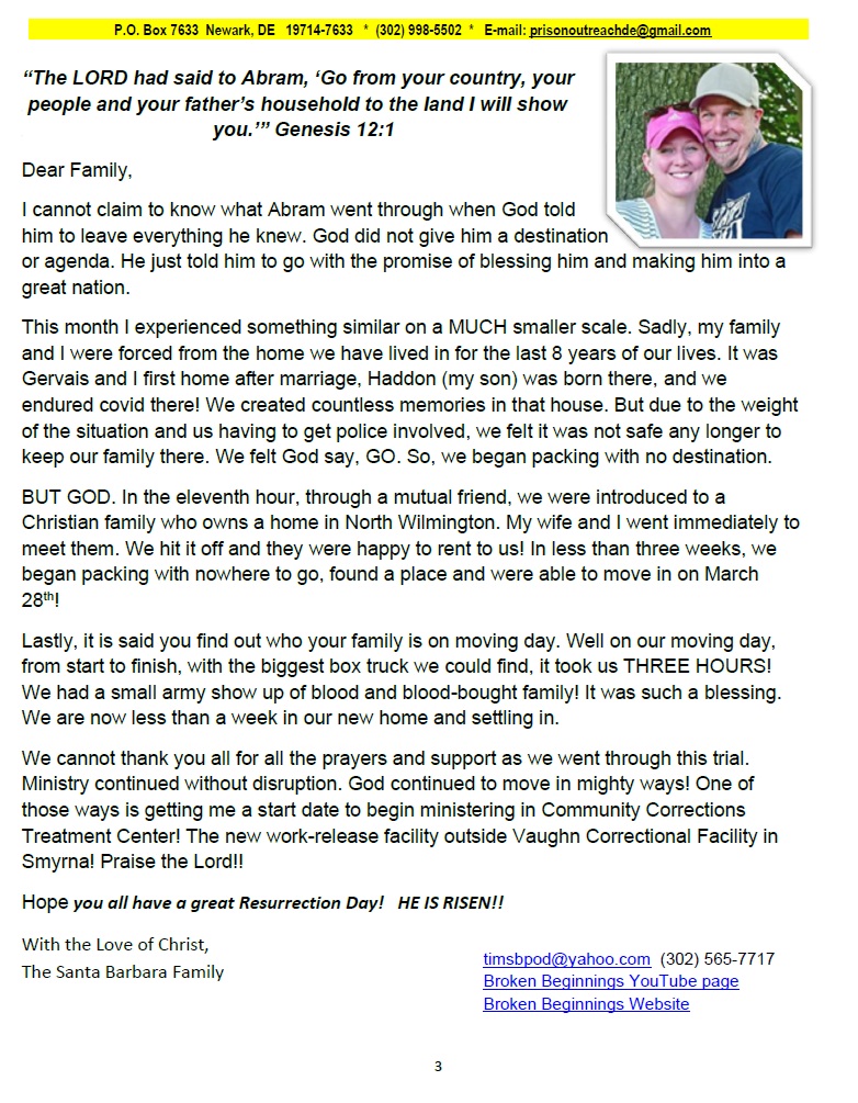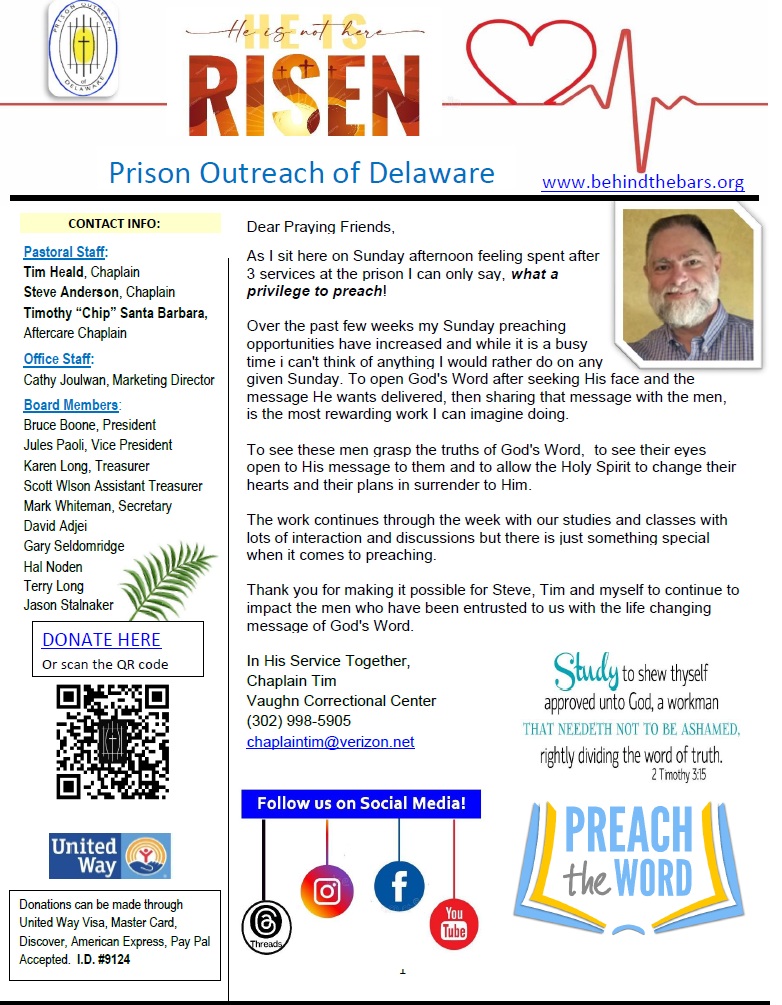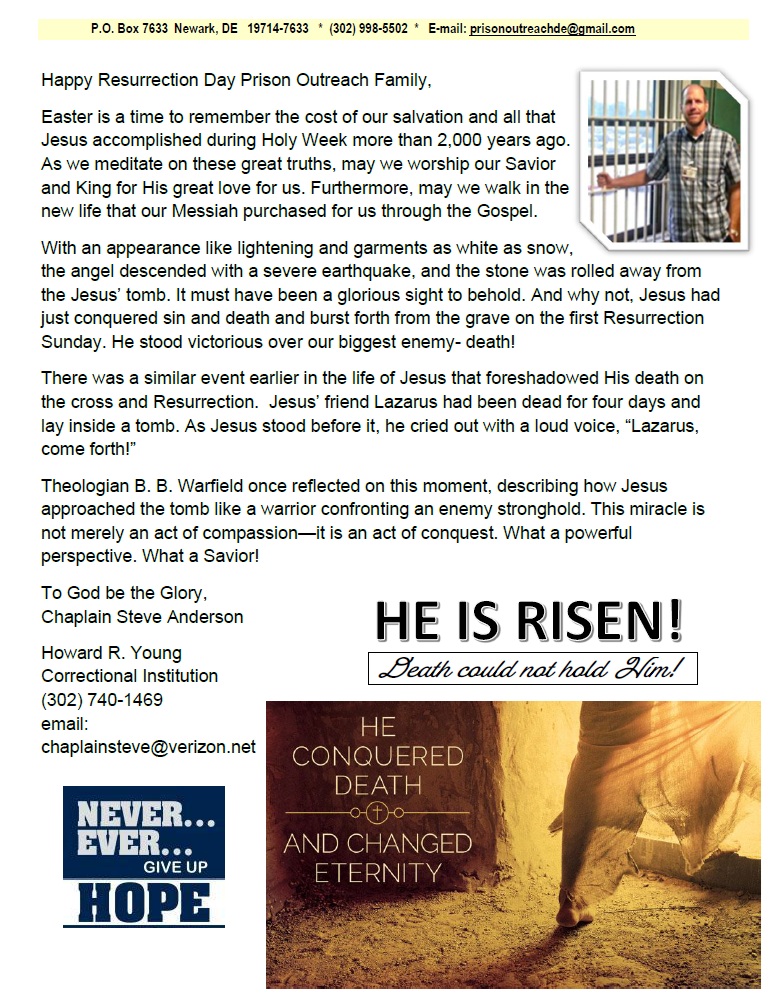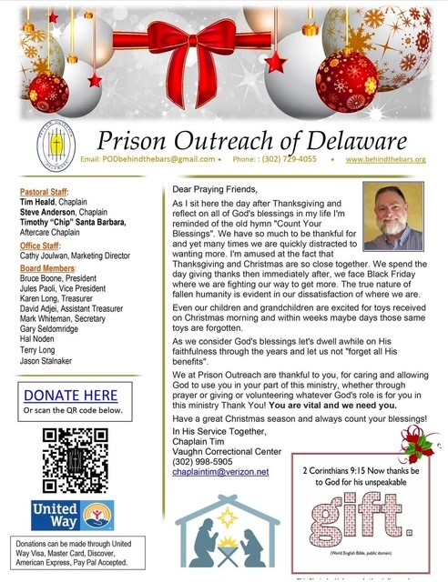 You can support the Prison Outreach of Delaware ministry on line or by personal check. All donations are tax deductible. For more details, click here.